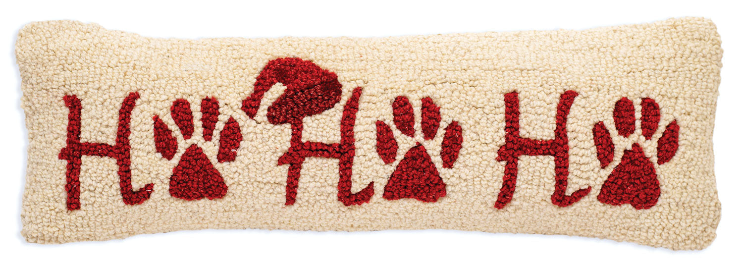 - Our Ho Ho Ho Woof - 8" X 24" Hooked Wool Pillow wool pillow has been hand-hooked with exceptional care by skilled craftsmen. The result is a premium decorative pillow that adds a charming touch of handcrafted excellence to any bed, sofa, or rocking chair.