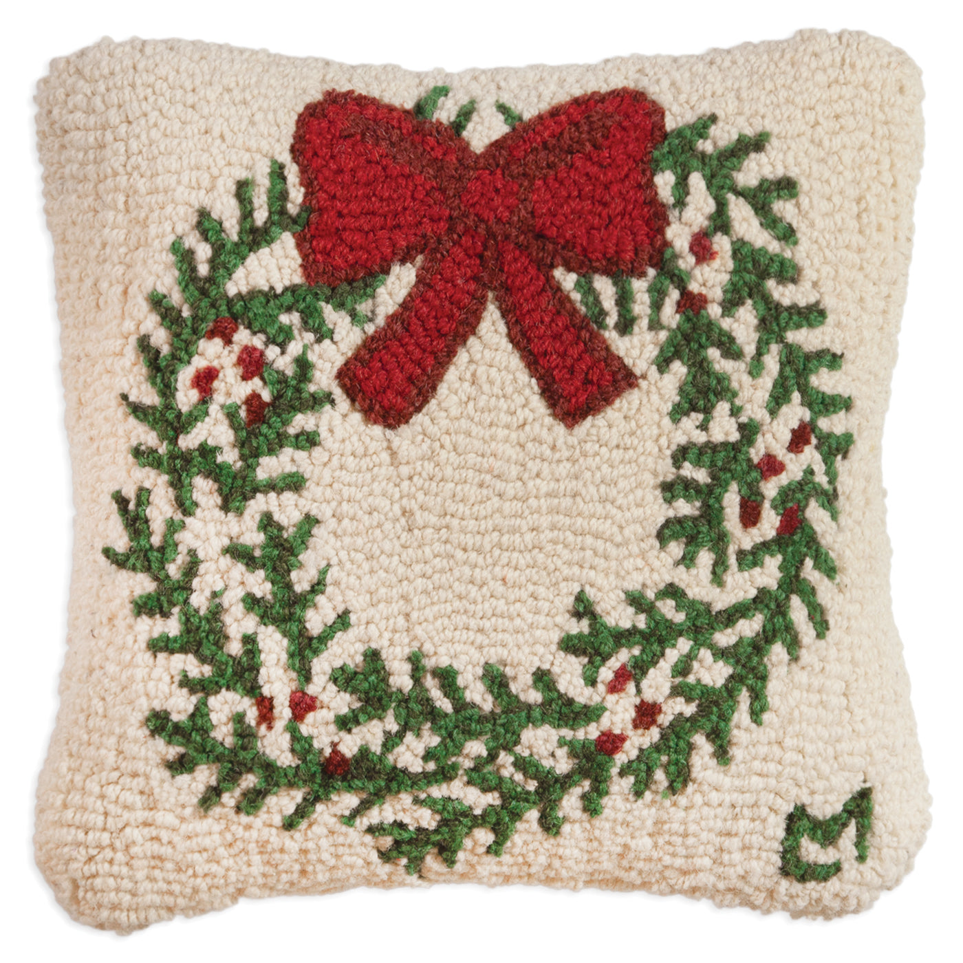 - Our Christmas Wreath - 14" x 14" wool pillow has been hand-hooked with exceptional care by skilled craftsmen. The result is a premium decorative pillow that adds a charming touch of handcrafted excellence to any bed, sofa, or rocking chair.