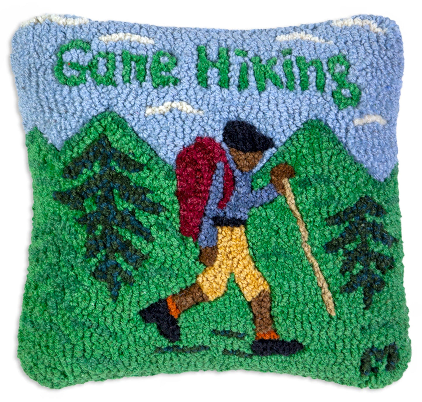 - Our Gone Hiking - 14" x 14" wool pillow has been hand-hooked with exceptional care by skilled craftsmen. The result is a premium decorative pillow that adds a charming touch of handcrafted excellence to any bed, sofa, or rocking chair.
