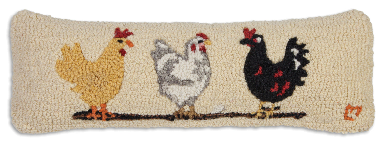 - Our Three Hens - 8" x 24" wool pillow has been hand-hooked with exceptional care by skilled craftsmen. The result is a premium decorative pillow that adds a charming touch of handcrafted excellence to any bed, sofa, or rocking chair.