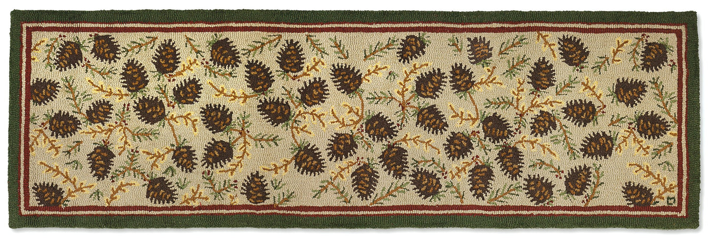 - Our Northwoods Cones - 2.5' x 8' Runner rug has been hand-hooked with exceptional care by skilled craftsmen—providing a comfortable cushioning experience for your feet and are made with durable wool and a cotton backing for added strength and durability. The result is a premium decorative rug that adds a charming touch of handcrafted excellence to entryways, kitchens, hallways, bedrooms, living areas, and more.