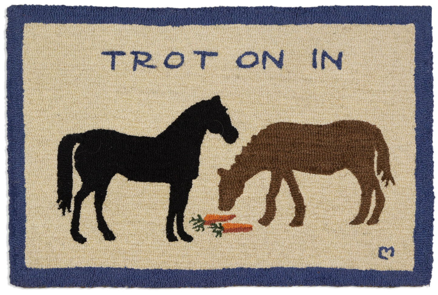 - Our Trot On In Horses - 2' x 3' rug has been hand-hooked with exceptional care by skilled craftsmen—providing a comfortable cushioning experience for your feet and are made with durable wool and a cotton backing for added strength and durability. The result is a premium decorative rug that adds a charming touch of handcrafted excellence to entryways, kitchens, hallways, bedrooms, living areas, and more.