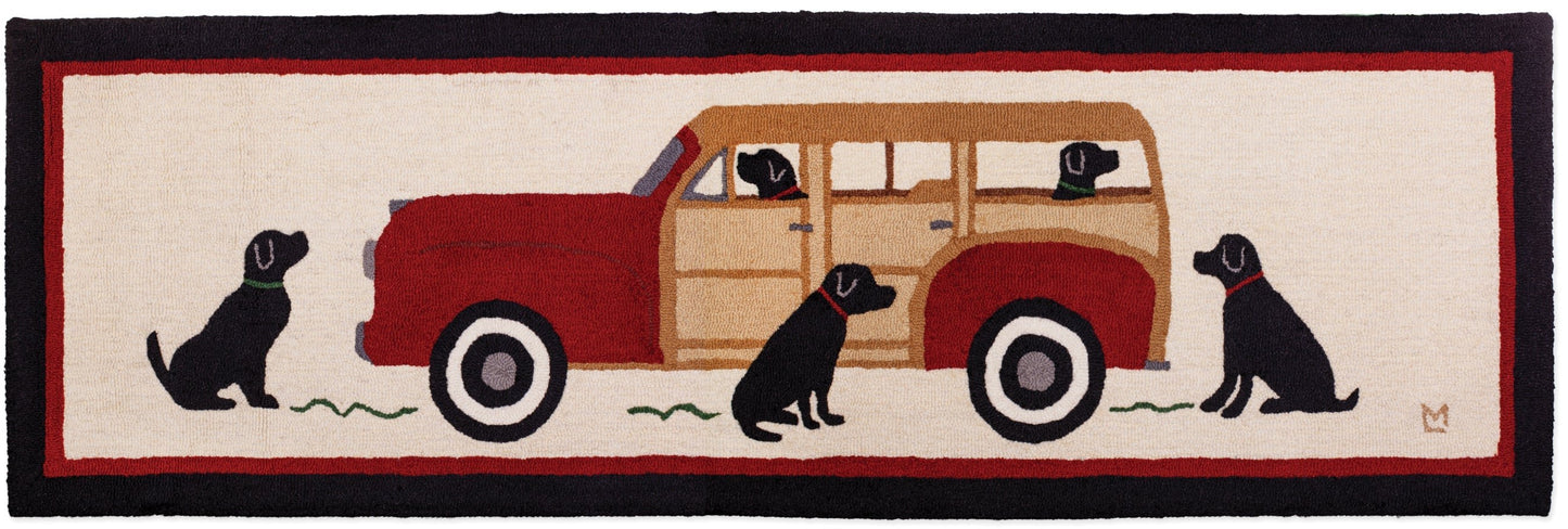 - Our Woody Wagon Dogs - 2.5' x 8' Runner rug has been hand-hooked with exceptional care by skilled craftsmen—providing a comfortable cushioning experience for your feet and are made with durable wool and a cotton backing for added strength and durability. The result is a premium decorative rug that adds a charming touch of handcrafted excellence to entryways, kitchens, hallways, bedrooms, living areas, and more.